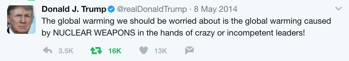 Я что-то не понял, он считает, что глобальное потепление происходит от того, что у Ким чин ина есть ядерные боеголовки? Или то, что мы должны опасаться глобального потепления от того, что Ким чин Ин использует своё оружие? Или это такая аллегория, что мол от того, что у Северной Кореи есть оружие всем жарко на планете стало? P.s. К слову сказать, после использования оружия нам грозит ядерная зима, а не потепление )))